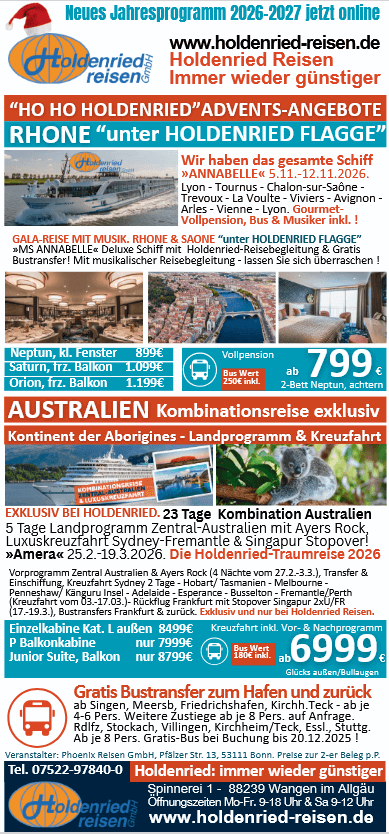 Buchen Sie Ihre Reise bequem von Zuhause rund um die Uhr im Internet, per Telefon oder Telefax -oder auch gerne per Mail. Genau so wie Sie es wünschen! Um Ihren Urlaub zum perfekten Erlebnis werden zu lassen, reisen wir für Sie mit auf Tour und betreuen Sie durch einen Holdenried-Reisebegleiter vor Ort individuell mit Herz. Die meisten unserer Gruppenreisen werden von erfahrenen Kreuzfahrtexperten begleitet, so sind Sie bereits von Anfang an bis zum Reiseende bei uns in besten Händen! Herzilch willkommen.