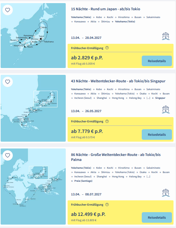 Sie erwarten Highlights, wie z.B. Japan, Singapur, Vereinigte Arabische Emirate, Mauritius, Südafrika und Namibia.  Leinen los!