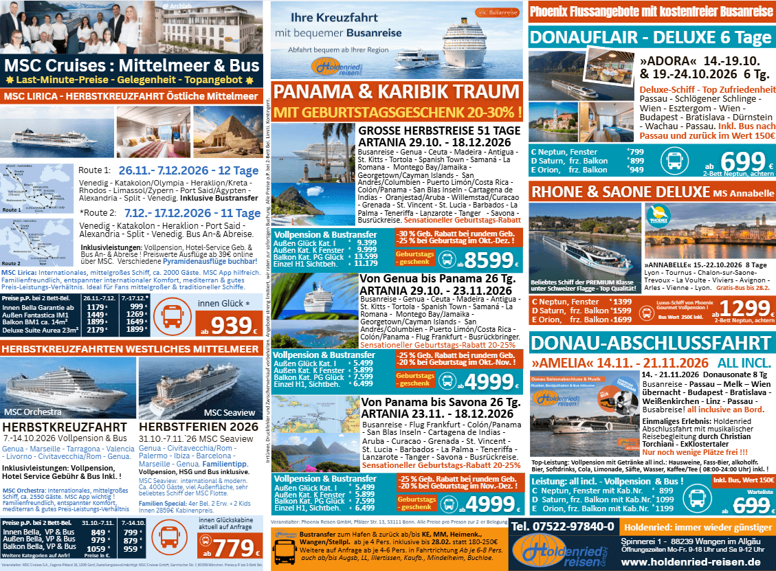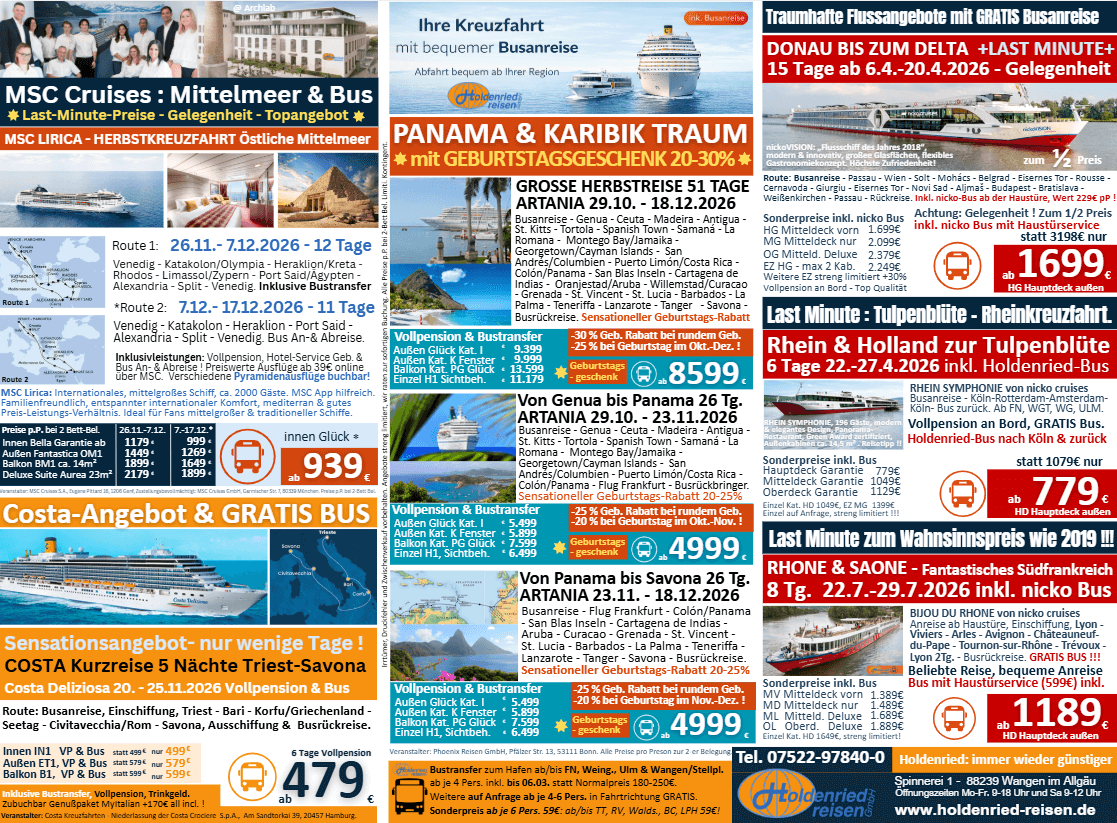 Sie suchen eine Kreuzfahrt zum besten Preis mit erstklassigem Service? Dann sind Sie bei der Holdenried-Reisen GmbH in Wangen im Allgäu genau richtig. Seit über 40 Jahren Kreuzfahrtspezialist beraten wir Sie kompetent, persönlich und mit echter Leidenschaft für Reisen.